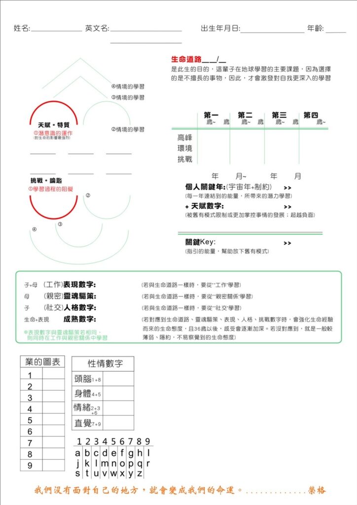 諮詢使用的「個人數字能量圖表」與「個人年的能量圖表」
